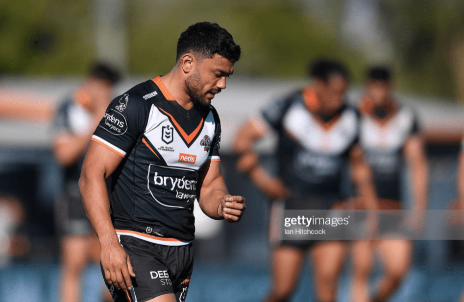 David Nofoaluma took the kickoff and Joe Ofahengaue the opening run, before the Tigers got a restart on tackle two, with an offside from Briton Nikora. They were over the halfway line by play four, where Luke Brooks booted it out towards the left edge. Not only did Will Kennedy take it on the full, but Moses Mbye was pinged for high contact, as Jack Williams ferried it up the middle, channelling his critical performance last week as the only forward to make 100 metres against Newcastle.