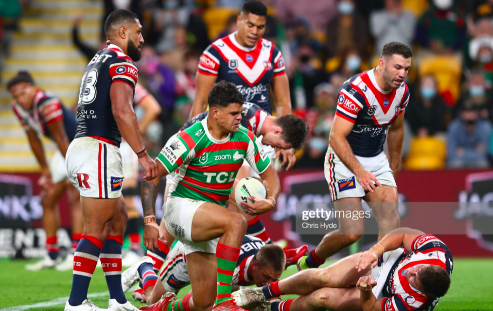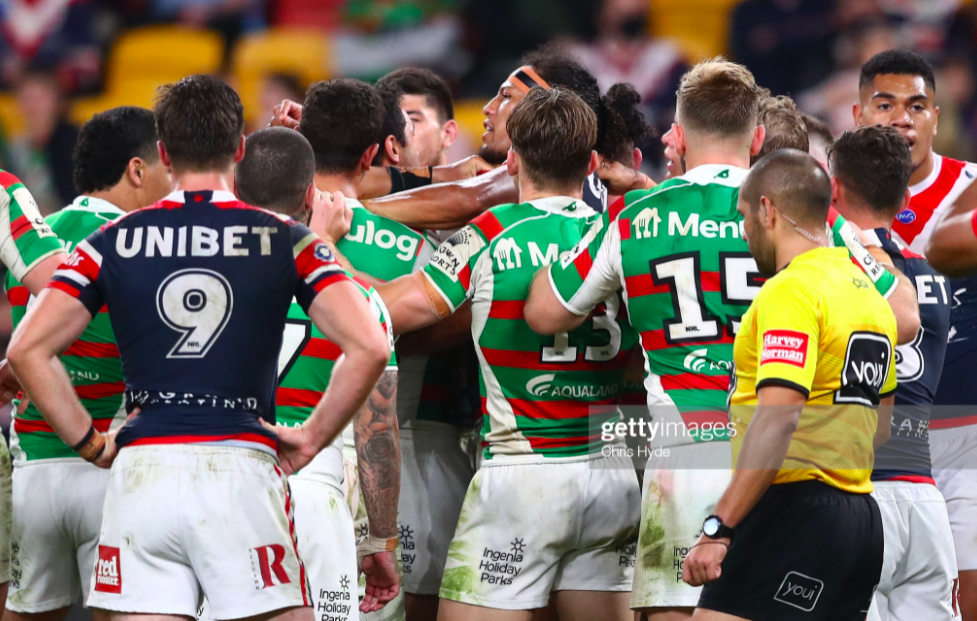 Clashes between the Roosters and Rabbitohs are probably the one local derby that can generate an Origin intensity on a regular basis, and Friday night’s game immediately enters the canon and lore of this oldest of rugby league rivalries. Latrell Mitchell was responsible for most of that animosity, turning the match into a full-blown spite fixture after an egregious shoulder charge that saw him return to the park only ten minutes after he’d sent Joey Manu to hospital for a fractured cheekbone, resulting in the most volatile fourth quarter this year.