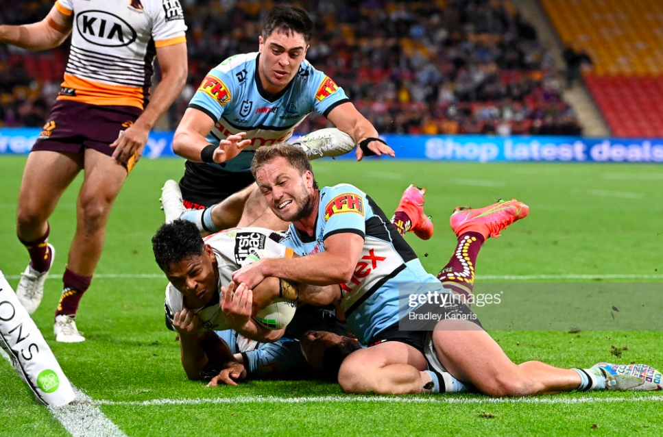 Luckily for Cronulla, there were still enough big men in place to just hold him up, although Milford secured his second dropout with a well-weighted chip that Katoa was never going to bring back into the field of play. Despite taking seven minutes to touch the footy, Brisbane now had over 50% of possession, and took the lead with another rapid try on the left side of the park – this time from Niu, who took a superb double-pump from Milford, pivoted off the left boot, and curved around behind the uprights to set up Farnworth for the first conversion.