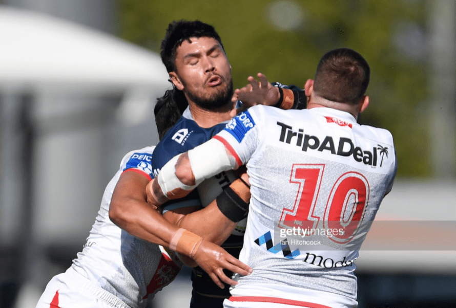 Lomax had also scored during the Round 2 win against the Cowboys, so it felt promising that he’d put down the first try here, and while he missed he conversion, his misfire was quickly eclipsed by Kyle Feldt, who sent the kickoff out on the full. All of a sudden, the Dragons were camping out in the opposition twenty, but their staying-power wasn’t as staunch, with Amone coughing it up just as he was reaching the ten. Mitchell Dunn didn’t waste any time making an impact off the bench either, coming in strong on Lomax when the Red V got the ball back.