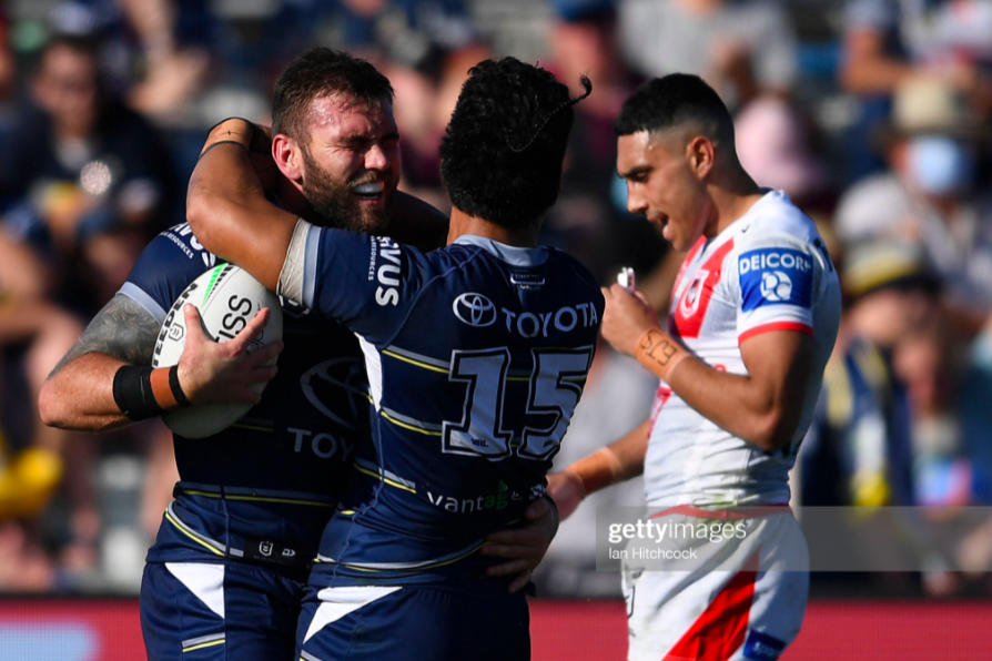 Instead, De Belin made the last and most critical mistake of the game, following his botched offload by culminating a series of charges at the line that grew more desperate with each tackle, until the Dragons were playing hot potato with the football. It was all going to come apart at some point – he was just the fulcrum, as Taulagi took his pass on the bounce, stormed through the line, and shot it across for the Hammer to end a ten-game Cowboys losing streak.