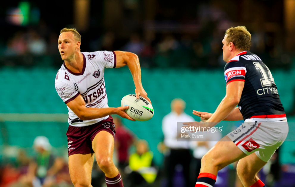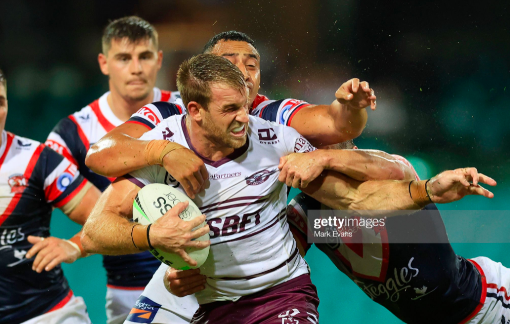 Not only did Manly fail to capitalise on these two errors, but they ushered in the nadir of the Sea Eagles’ night. Midway through the next set, DCE shaped a standard short pass to Harper, only to find his backliner totally unprepared for it, jettisoning the Steeden to careen into touch. You could tell Daly was enraged at this amateur moment, but he didn’t have time to reflect on it, since Tupouniua responded by busting through Harper for the best run so far.