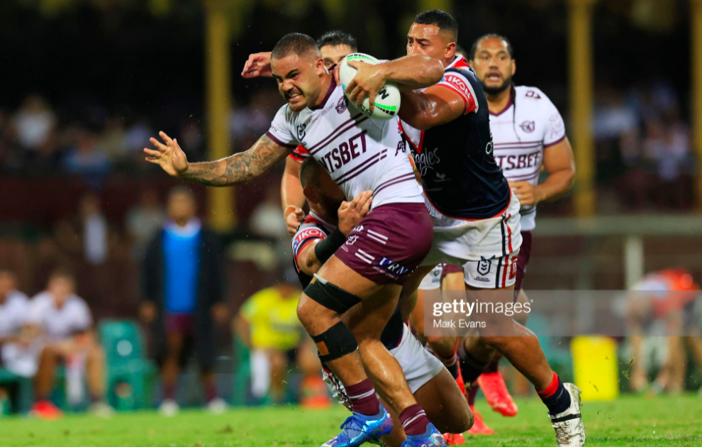 Manly needed a momentum shift, and they almost got it when Tupou coughed up the ball on play one of the restart. It went backwards, so Keppie was determined to force the error three tackles later, when he set his sights on Tupouniua to smash the footy free. The visitors now had their first really aggressive attacking set of the night, driving the Steeden deep into both wings, and ending up on the right, where Turbo took his first decisive run, and glimpsed a break in the defence, only for Momirovski to slam in and bring him down ten metres out.