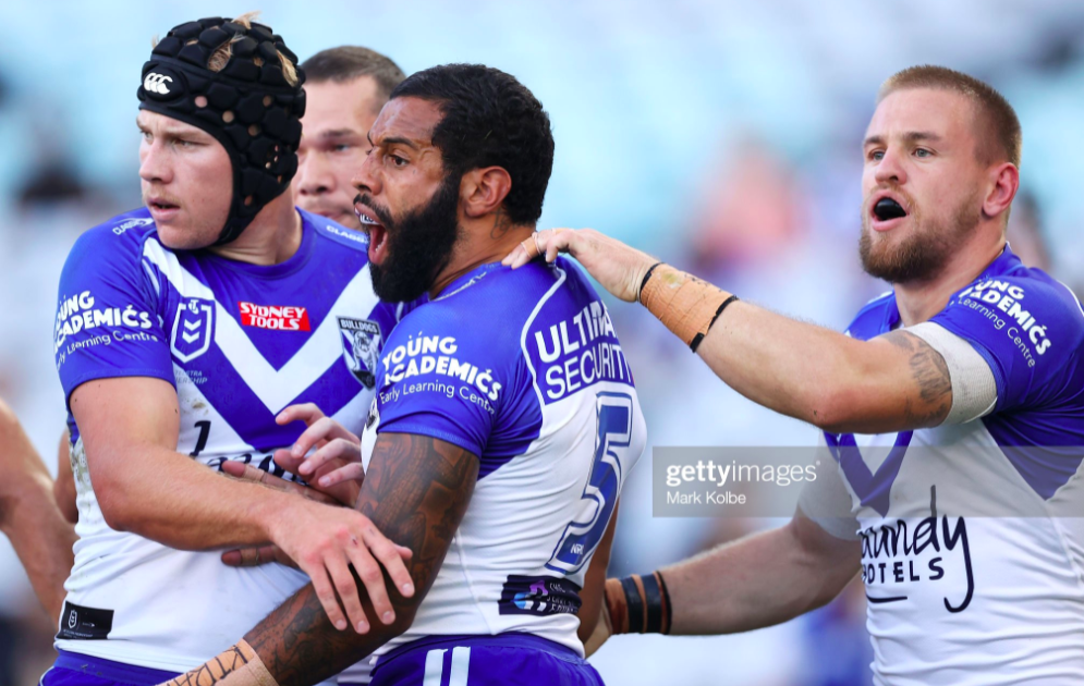 Burton got them inside the ten with three tackles to play with, thanks to a big left foot step, and they headed right, where the set started to fragment with a bouncing Jake Averillo pass, only for the ex-Panther to clean things up back on the left with a perfectly weighted grubber that Niu had to smother right on the dead ball line. Yet for the second time this afternoon, Hetherington coughed up the footy just as the Dogs looked set to consolidate, thanks to Reynolds’ first really inspired kick – a long low effort with a nightmare bounce on the sideline.