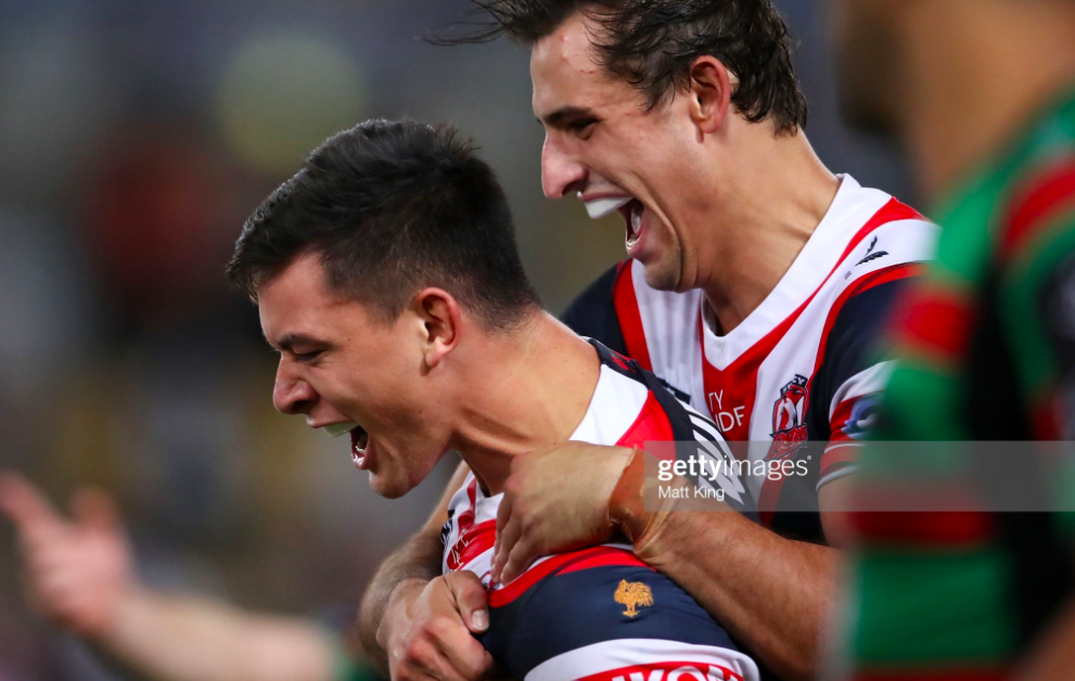 Walker scooped it up and withstood a Cook hit, before the Roosters headed right, where Manu ended up with it. In a sublime sequel to his facial fracture, he stepped back inside, broke through the line, and busted through Latrell at the death, before rising from the try to let the South Sydney fullback cop the full force of his triumph. Walker added the extras, but there was no doubt the Roosters had the flow now, as a swarm of Sydney defenders suffocated him under his next high ball, before the Bunnies got their next penalty at just the right moment.
