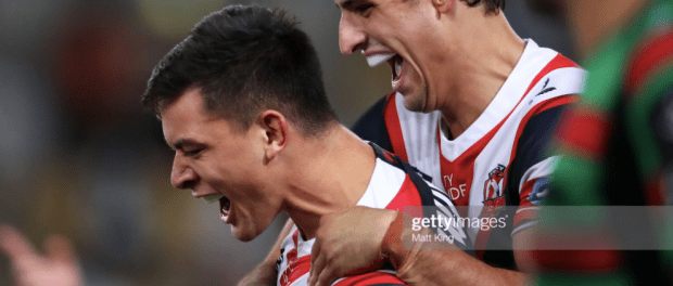 The Roosters now had a full set on the South Sydney line, and then a restart when Teddy copped some incidental high contact from Milne on the left. Connor Watson almost crashed over beneath the crossbar, Teddy tried to dance his way through the line, and Tupouniua ended this third straight set on the Bunnies’ line by coughing up the footy on the third play, when Milne slammed in for some redemption after the two penalties that set up all this field position in the first place. Try as they might, Sydney just couldn’t draw on that Manu opener.