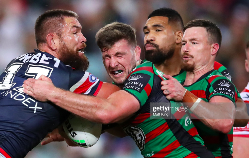 The Bunnies almost drove Sio Siua Taukeiaho back to his own try line on the first carry, while Lindsay Collins barely cleared the twenty on tackle three, and Luke Keary was forced to kick well inside the forty. On the back of that excellent defensive set, Latrell bumped off Manu and almost made it halfway on his first charge, and Lachlan Ilias booted it from the Roosters’ thirty, drawing in Collins for a pretty mild penalty while his leg was in the air. Souths now had a full set inside the Roosters twenty, as Keaon Koloamatangi took it straight up the middle.