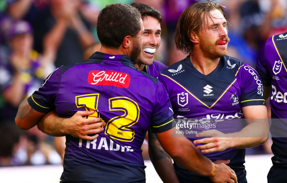 Josh King built on Bromwich’s platform, and culminated an incredible start to the year (64 minutes against the Tigers, 67 against Souths) with an even later offload, falling to his knees five metres out, but still managing to twist around and feed it on to Brandon Smith. Despite battling a broken hand, the Cheese got his head low and burrowed through Gutho for the first try of the afternoon beneath the posts, setting up Papenhuyzen for an easy conversion from right in front. After two botched tries, the third had been the charm, a rousing purple start.