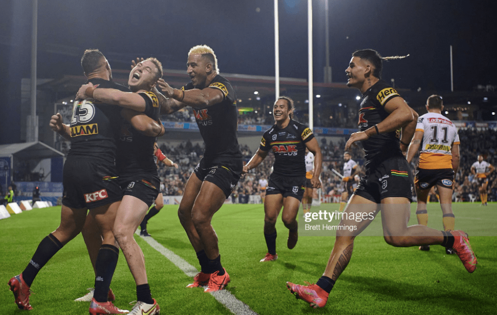 Reynolds went short with the dropout but sent it over the sideline on the full, and in one last alpha display the Panthers chose to run at the line, rather than taking the two. They got six again early in the set, and it all ended as it had to end – with a reprise of the sublime Cleary-May combo, as halfback booted it to the left, and winger put it down, before it was rebranded a Tago penalty try. Footy just doesn’t get better than this, and it’s amazing to think where the mountain men can go with this flow with another two thirds of the season ahead of them.