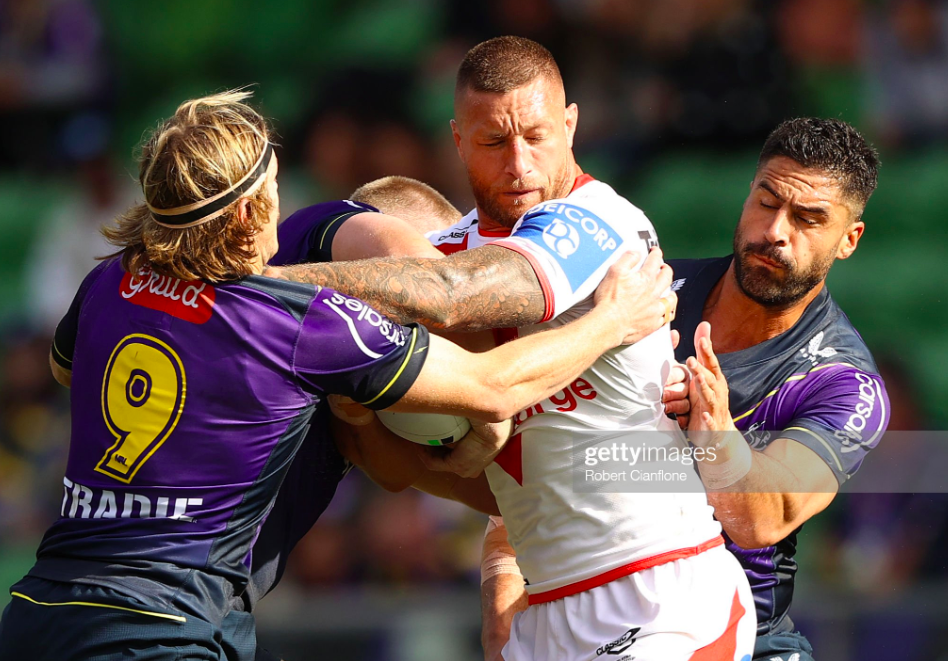 It was as if Melbourne had experimented with how far they could elasticise before Munster and Grant brought it all together, and with Meaney adding another offload, they were edging ever close to the 1935 Roosters’ record for most tries scored in the first rounds of a season. This was the moment where the Dragons really started to capitulate, as Grant busted through on the restart and kicked at speed. Ravalawa did well to take it in the corner, but errors from Feagai and Mbye, and an offside for Amone, put them back on their own line.