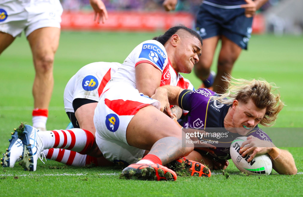 Nick Meaney was up to it, putting his whole body on the line to leap a metre above Mikaele Ravalawa, and getting his men a boost back down the park when the St. George no. 5 got done for aerial contact. Justin Olam took the first tackle at the thirty, the Dragons withstood big charges from NAS and Cam Munster up the middle, and Grant continued to extemporise, scooping up the Steeden after noticing nobody was waiting at marker, and getting Melbourne in place for a rapid sweep to the right that ended with Suli forcing a Reimis Smith knock-on.