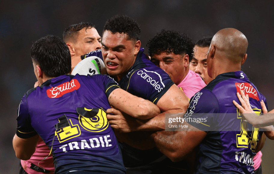In that sense, they were a bit like the Sea Eagles the night before – and Penrith were only warming up, as Moses Leota took his fifth run to make twenty up the middle, and Cleary continued to edge towards the Melbourne line with his kicks, booting the next one just outside the purple forty. The Storm couldn’t have asked for a better time to receive the first penalty of the night (and the first Penrith error in thirteen minutes of football) when Luai was called offside in the ten, and hit the twenty three plays later for their best position so far.