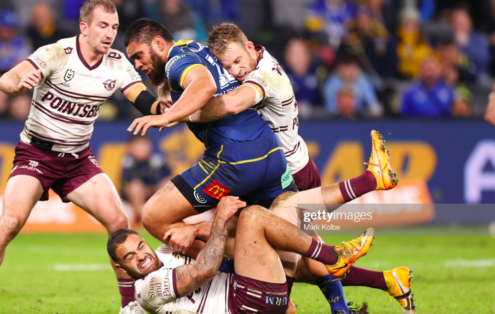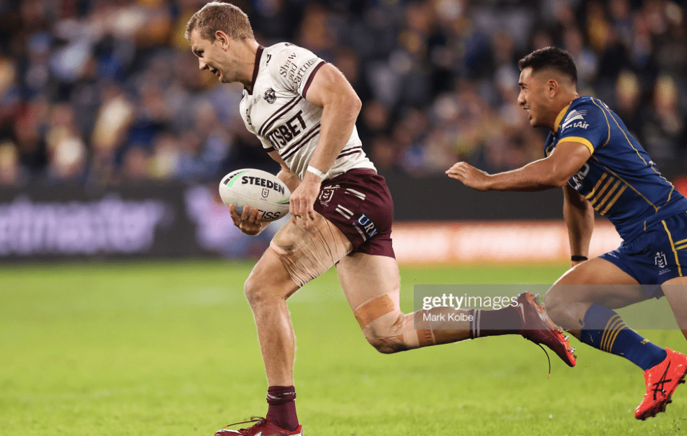 Despite a massive charge from Junior Paulo on play one of the restart, the Sea Eagles defended pretty well, forcing Moses to slot his next one just shy of halfway, and garnering themselves an extra tackle when Garrick reached a boot back over the try line. It was a rare misfire from the Parramatta sharp shooter, and had the chance to rattle the blue and gold, so Manly couldn’t have asked for a better time to get Dylan Walker and Marty Taupau off the bench, and for the second time made the very most of the opportunity handed to them.