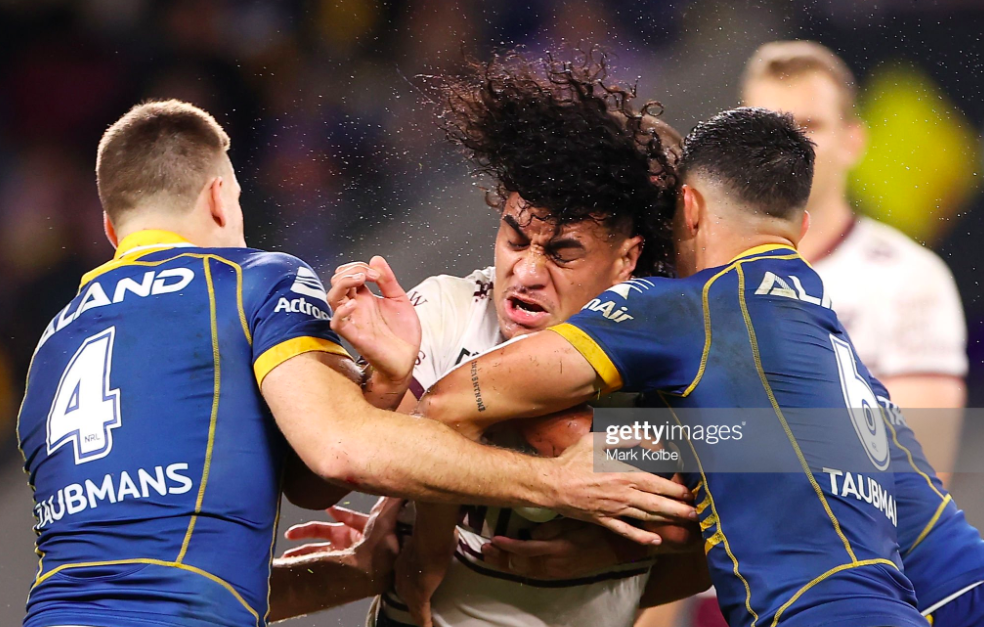 Parramatta hadn’t come from behind when trailing at the break in 2022, so they had a challenge on their hands when they trotted back onto the park, especially without their key playmaker. Conversely, the Sea Eagles had to make a statement now, and Walker and Croker started with a big combined tackle on Papali’i, before Walker came in again with Taupau to prevent Matterson making too many metres. Dylan Brown was well within the forty by the time he took the kick, while Marty muscled it across halfway three plays into the next set.