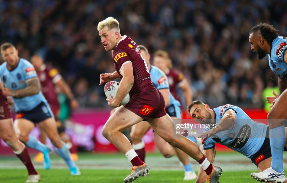 The Maroons seemed momentarily exhausted at the start of the next set, especially since Coates was now leaving the field for good after sustaining an injury a few minutes before, as Jeremiah Nanai became the next Origin debutant. Yet Carrigan woke them up with a barnstorming midfield sequel to his charge beside the posts, accelerating so quickly that the speed got the best of DCE, who slipped on the turf, and careened straight into Wighton, who was briefly scrutinised when Queensland send the contact upstairs.