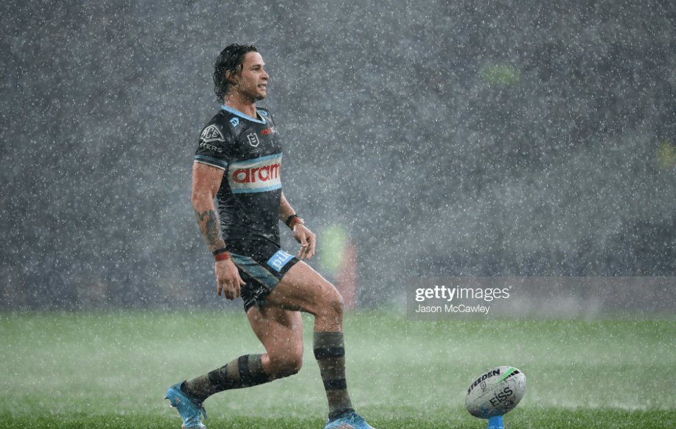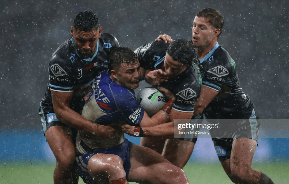 Royce Hunt set the tone with a huge charge into Paul Vaughan, as the Sharkies made their way up a quagmire that was already full of muddy puddles, before Nicho Hynes slotted it all the way to the Canterbury line, as wave after wave of Cronulla packs surged in to prevent the Dogs breaking the twenty until tackle three. Burton only got to the thirty for his first kick, and in the midst of such a swarm of defenders, had to opt for a conventional effort, before Jeremy Marshall-King tried to reset the balance with a massive hit on Blayke Brailey.
