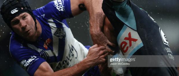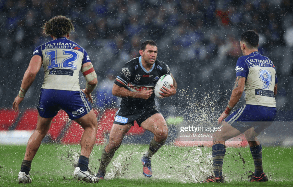 Still, the Sharkies got through it, Burton crashed onto the high ball after Ramien and Ado-Carr failed to contain it in the air, and the Dogs ploughed through the mud, copping so much combined friction from the weather and opposition that Burton only got to the thirty for his next kick. After such prolific games against Parra and the Tigers, they only had six points to their name here, so even if they didn’t look likely to win, they could do with a consolation effort, a second half try to propel them into their clash with the Bunnies after the bye.