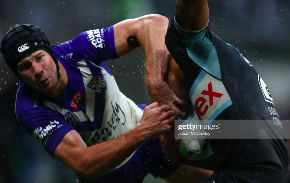 Burton got one of his most comprensive kicks at the end of the next set, parabolising it all the way to the Cronulla ten, and giving his men enough time to mount a decent wall, as the hosts struggled to break halfway for the first time, forcing Hynes to take the kick inside his own forty. The turf was really unpredictable now, smooth enough for Averillo’s earlier grubber to have skidded into touch, but so sodden where the Steeden landed that it stopped dead a couple of plays later, gifting Casey the easiest pickup of the night.