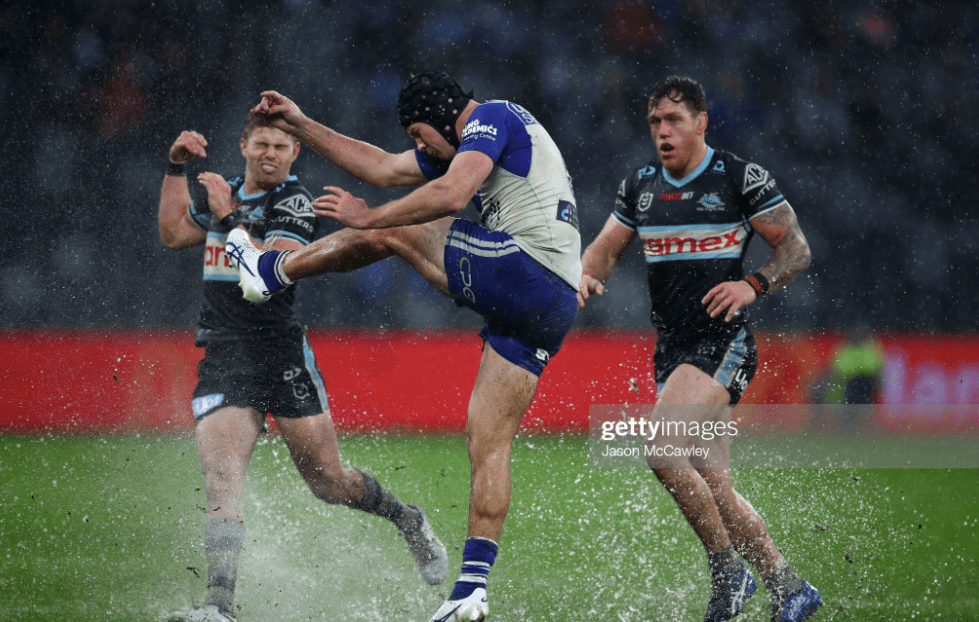 Combined with the wet, that Canterbury spirit would keep the Sharkies to only two more tries too, which was itself a victory of sorts, since we were dealing with a top four and bottom four team here. The pools had only deepened when they returned to the park, as the Dogs took the first set, rolling their play-the-balls through centimetres of water during the opening runs, before Burton hurried a wobbly one down to Moylan, booting it extra hard, as if to compensate for the liquid it had accumulated after this slog of a set.