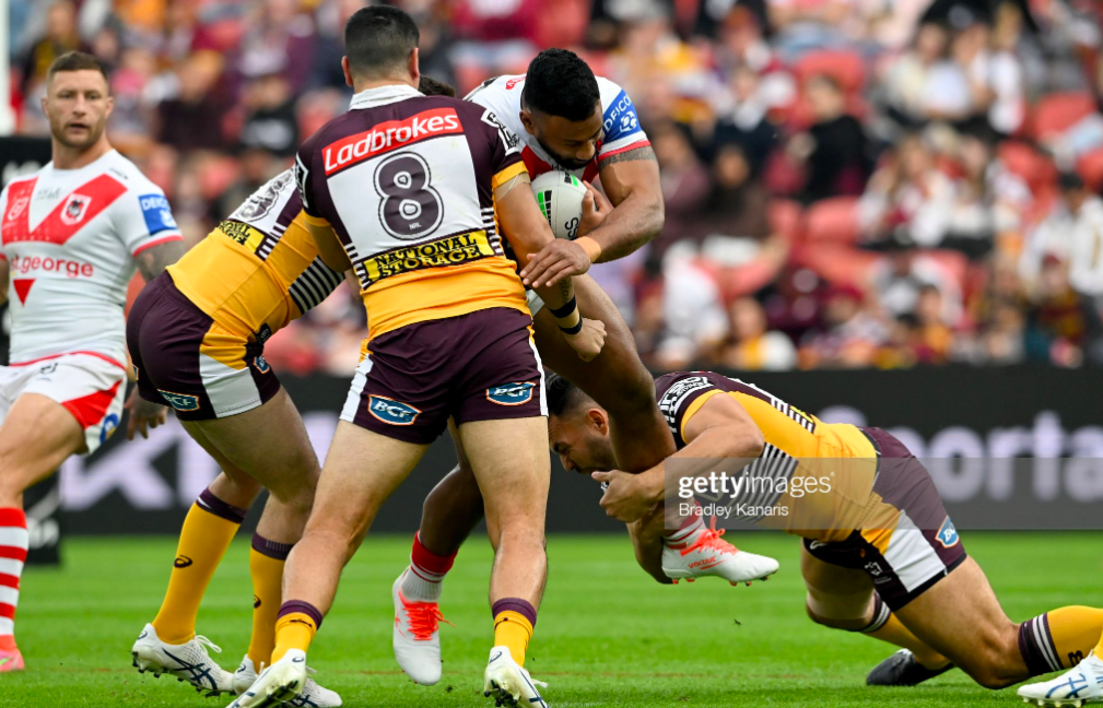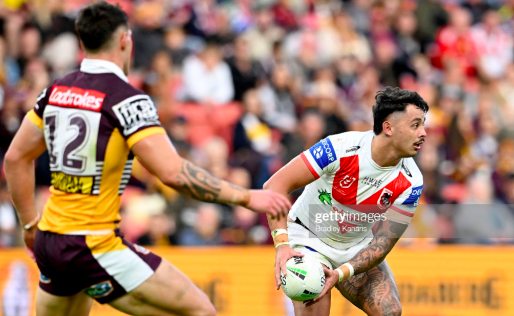 Jack Bird shifted the kickoff across for Blake Lawrie to take the first run, the Dragons moved it fast and clean up the middle of the park, and Frank Molo got Jayden Sullivan to the halfway line for the opening kick. Delouise Hoeter took it, in his second game for Brisbane, and the home team shifted it right immediately, where we got the first Staggs-Suli contest of the day, as Moses grabbed Kotoni round the legs, holding on long enough to force the footy free. St. George had a scrum from the Broncos’ thirty before the hosts had completed a set.