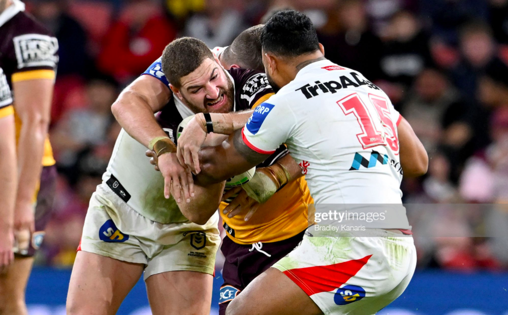 Staggs was now well and truly in the spotlight, and had thoroughly bounced back from his opening clash with Suli, eluding a crossfield chase from the St. George backliner after busting through Feagai, and then forcing the dropout from Feagai himself, who had two shots at a Mam grubber behind the line, and would have secured it on the second if not for Kotoni getting up in his face. Hetherington had barged into Sims on the previous set, and almost stepped past him again here, as Brisbane got ready for the back half of the count.