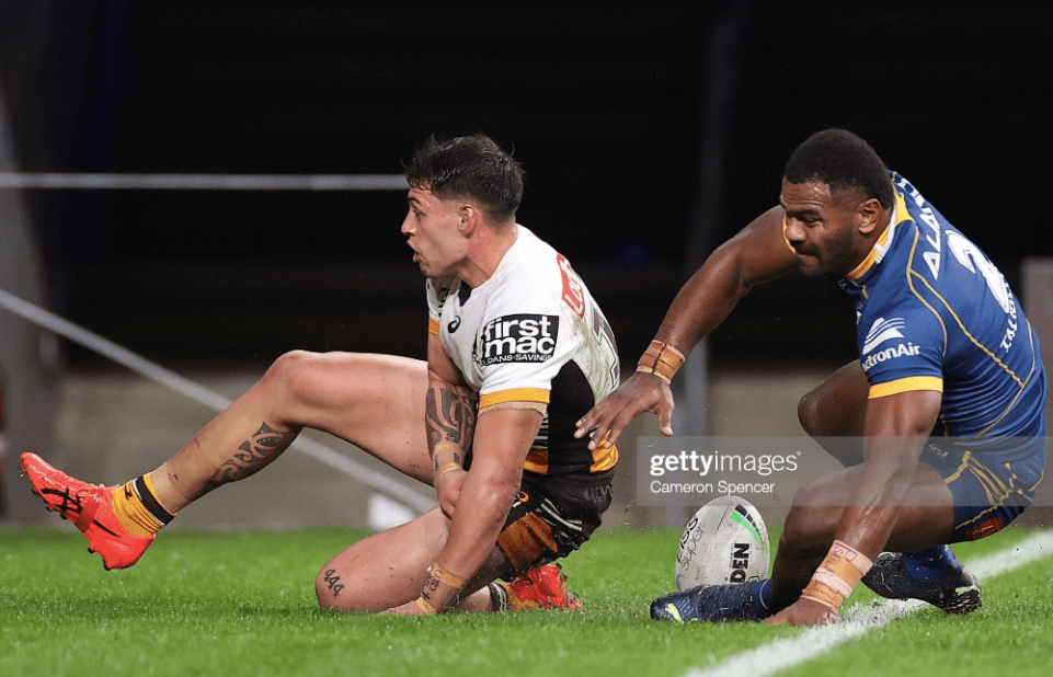 Add Kobe Hetherington off the bench, and it felt inevitable that the Broncos would cross over again before the break. Yet the Eels found some late flow off two Brisbane errors beneath the high ball – first when Oates tapped it back to Papali’i, then when Pereira took it on the sideline and stuck a boot into touch after the fact. That was enough to get Parra back in the groove, as Dylan Brown lobbed a harbour bridge ball out to Sivo, who popped it back inside to Gutho just in time as Reynolds tumbled him over the sideline.