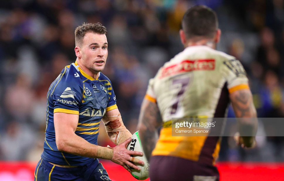 Carrigan was on fire now, taking two big carries, the second of which put him into Parramatta territory, where he almost sent Flegler through the line, so the Eels needed some captain’s vision to restore their flow – and got it, when Gutho sneakily stuck a boot over the sideline while Reyno’s chip was still moving to prevent Brisbane having any chance of a second kick. It was the first last tackle option in a while when the Eels had come off the victors, and Matto built on it with a flick out the back to Gutho, who won six again off Riki on the next run.