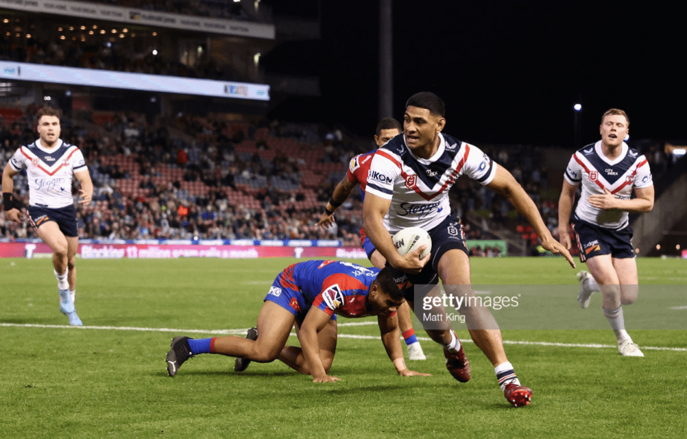 Jacob Saifiti took the first run back, and the Knights moved it methodically up the park, making about ten metres a carry, albeit decelerating before halfway, forcing Milf to take the kick in his own end. Conversely, the Roosters got a full set in Newcastle’s end immediately, thanks to a marker error from Saulo in the face of a tackle two run from Tupou. Radley played the ball right on the halfway line, and Momirovski and Teddy set up another scintillating right sweep that saw Suaalii almost back his way through Enari Tuala to score in the corner.