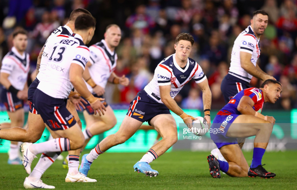 Things now accelerated for the Roosters, as Fitzgibbon was called offside immediately, and Brailey got done for marker error halfway up the park, giving JWH the chance to take tackle one inside the Newcastle red zone. They got six again a play later, off a Crossland ruck error, and finally felt as if they’d matched the Knights’ flow of the first quarter, even if Teddy was unable to do much with a short side play from Keary out on the left. In a microcosm of this tightly fought game, Lee glimpsed a sublime long-ranger, before the Chooks finally scored.