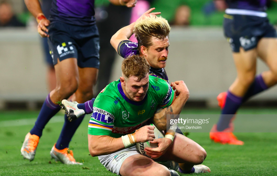 Faced with Munster, who’d had a pretty quiet opening, he sent out a massive right hand fend to bump the Storm’s best player over the sideline, before disposing of two more Melbourne defenders on his way to the chalk. After seven minutes defending their line, and without a single tackle in opposition territory, the Raiders had four on the board – and while it remained four after Fogarty missed the kick, he did better with the next bomb, capping off a stellar restart by floating it so mercurially that Munster only just survived a nightmare of a bounce.