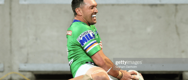 It all came down to the final second, when Ashley Klein deemed that both his gaze and hands had remained locked on the Steeden – the right call, even if it made for an uncomfortable contrast with the supposed aerial contact in the first stanza. Since Munster had knocked it back, and Grant had launched himself onto it in goal, this became a dropout, which CHN augmented with a beautiful low offload to Starling, setting up Papalii to finally get his initial second phase of the game as well, as the Raiders built to peak flow out on the right edge.