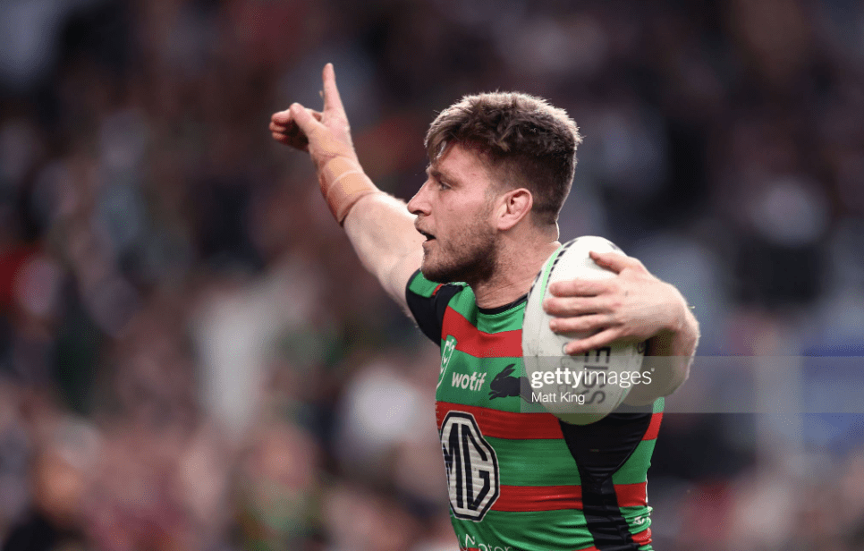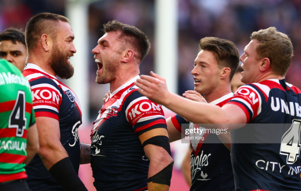 As the halftime siren rang, this was already one of the greatest clashes between Sydney and South Sydney, a challenge to both teams to deliver ever more sublime football when they returned from the sheds. The Roosters would have to do it without Crichton, who had failed his HIA during the break, and also, apparently, without Tupou, who didn’t return to the park either, even though they couldn’t activate Adam Keighran as eighteenth man unless they got another HIA. Burgess started with a huge charge into Radley, and ended with a penalty.