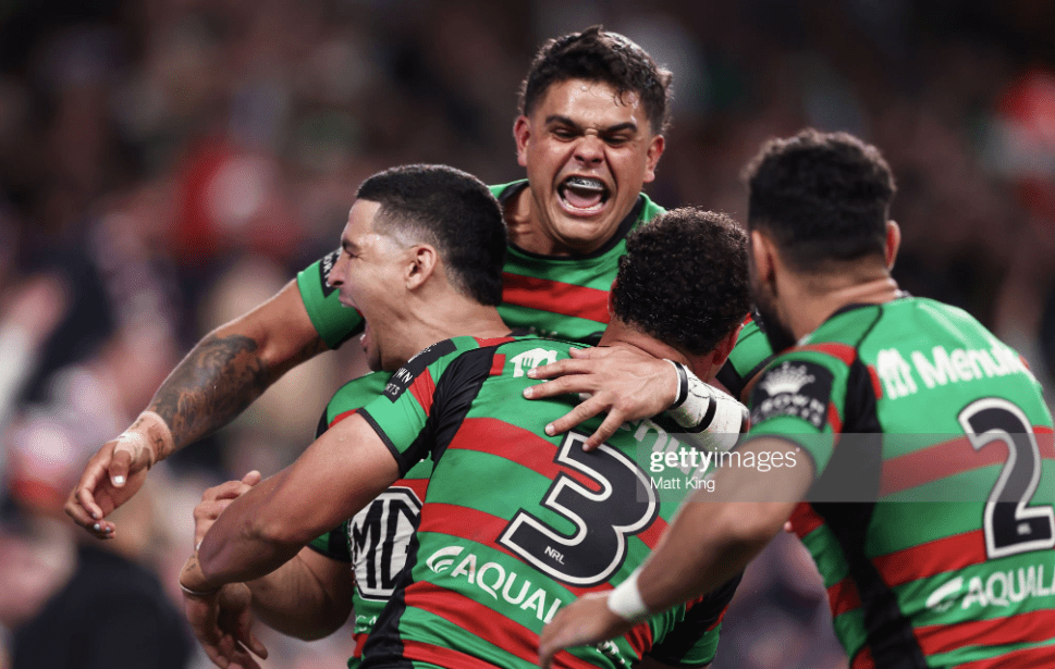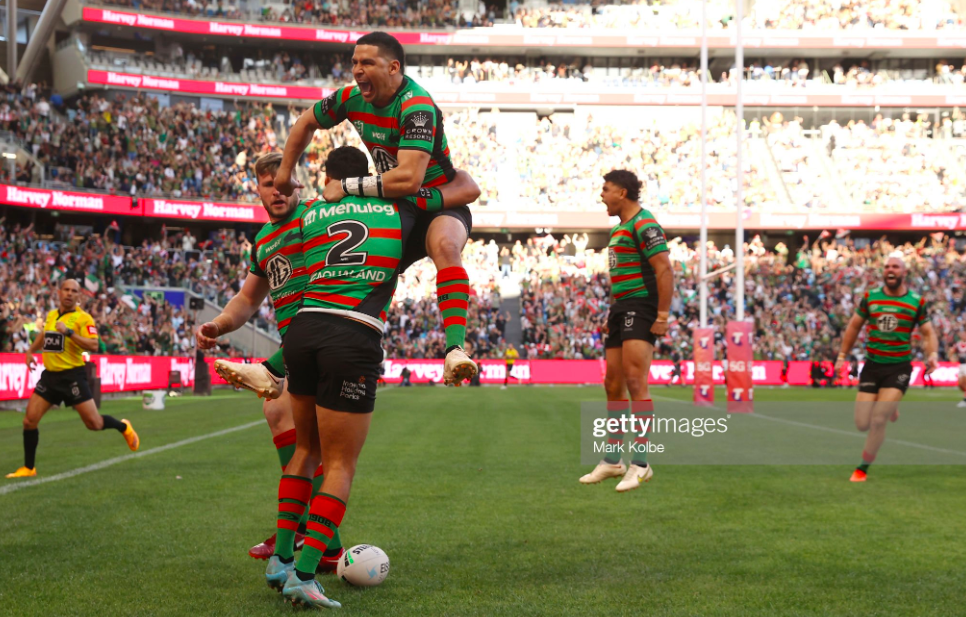 The Roosters now had their final shot of the night, and it came to an abrupt end when Hutchison leaped up to collect a Keary ball but sent it over the sideline instead. South Sydney didn’t score again, but they didn’t have to, since they had all the glory they could muster, with a win for the ages, in one of the most extraordinary of the many games between these two clubs. As the siren blew, Latrell reached out both hands, embracing and acknowledging the homage of the crowd, testifying to a footy miracle that not even he could have predicted.