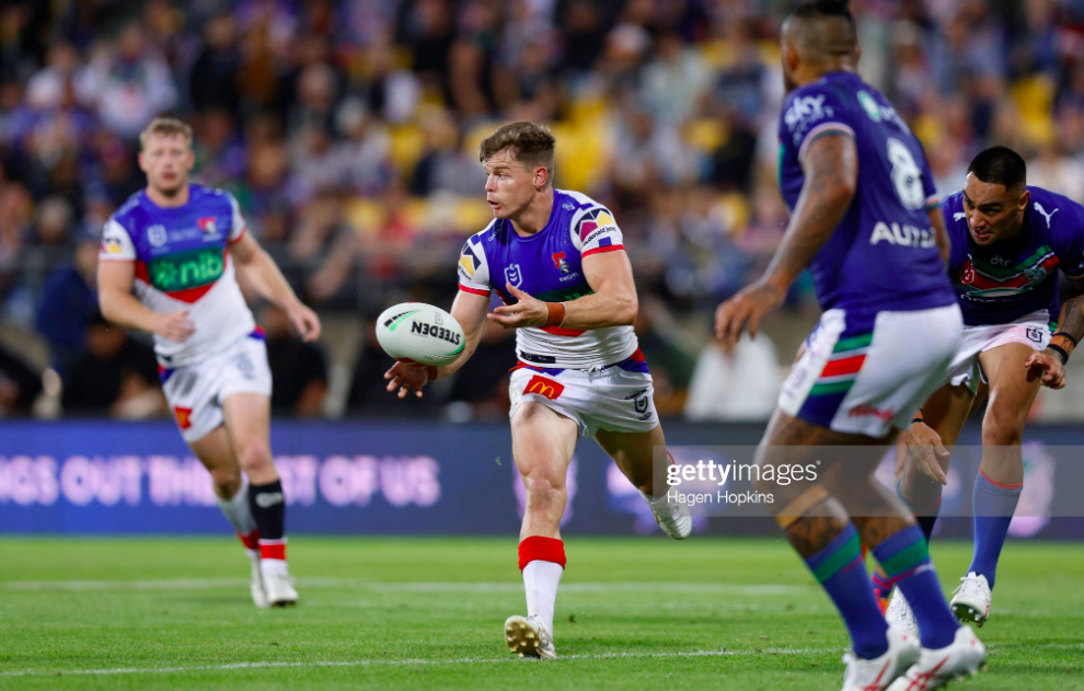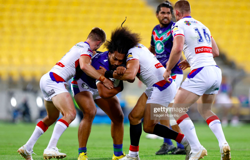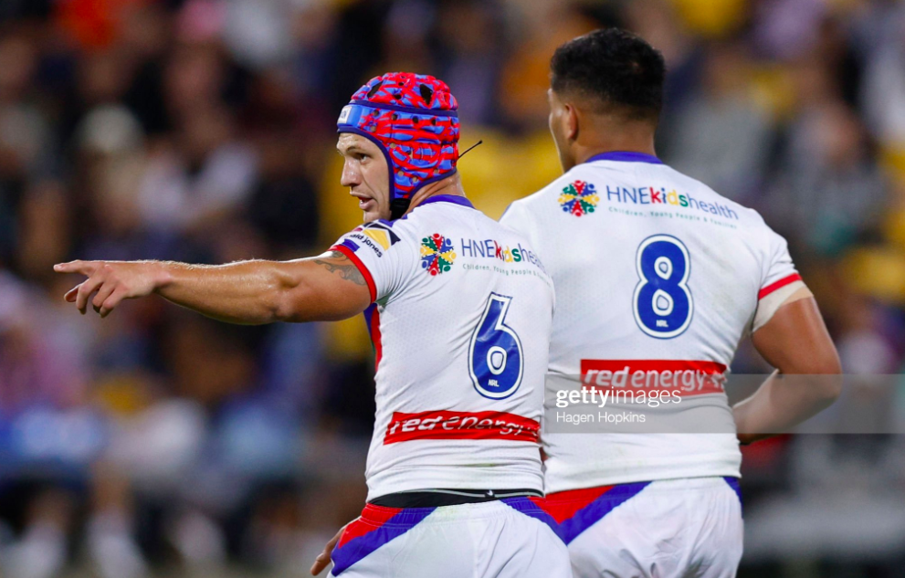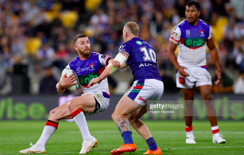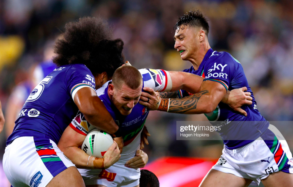 From there, it careened in goal, where Kosi was forced to bang it dead with Jacko right on his heels. Johnson might have sent the dropout to thirty-five metres from the Newcastle line, but Daniel Saifiti soon had it back on the third, getting Jacob to the brink of the red zone, where he lost in the face of a massive hit from Barnett, with Fonua-Blake on top. This was a critical turning-point for a New Zealand outfit sitting at 214-285 run metres, since even if they didn’t get points down, they had concisely and clinically contained the next major Newcastle surge.