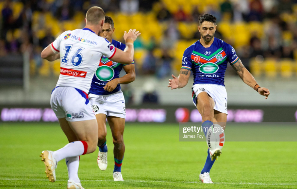 Moments later, Johnson won the battles of the halves with Ponga for the first time, reaching his full wingspan across the ground in order to dishevel the reinstated five-eighth enough to cough it up, in Newcastle’s third error of the match. The Warriors were charged into some great ruck speed on the following set, and Johnson was twenty-five out when he put boot to ball, but once again it was too shallow, and so Miller took it on the bounce. Ponga’s next kick was just as depthless, and with Kosi mirroring Miller’s take, the arm wrestle continued.