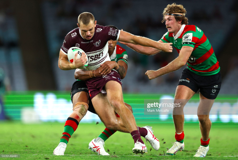 Tom Burgess had the first carry of the night, Michael Chee Kam took the second as a starting front-rower, Jacob Host the third in his first appearance since Magic Round last year, and then Cam Murray, who was driven back by Jurbo and Olakau’atu, before Dylan Walker got the first kick away, and Christian Tuipulotu was swallowed up by a committed South Sydney chase. The Rabbits made good metres on their next set as well, getting Walker to the Manly forty for his second kick, which Turbo collected after slipping briefly on the dewy Accor turf.