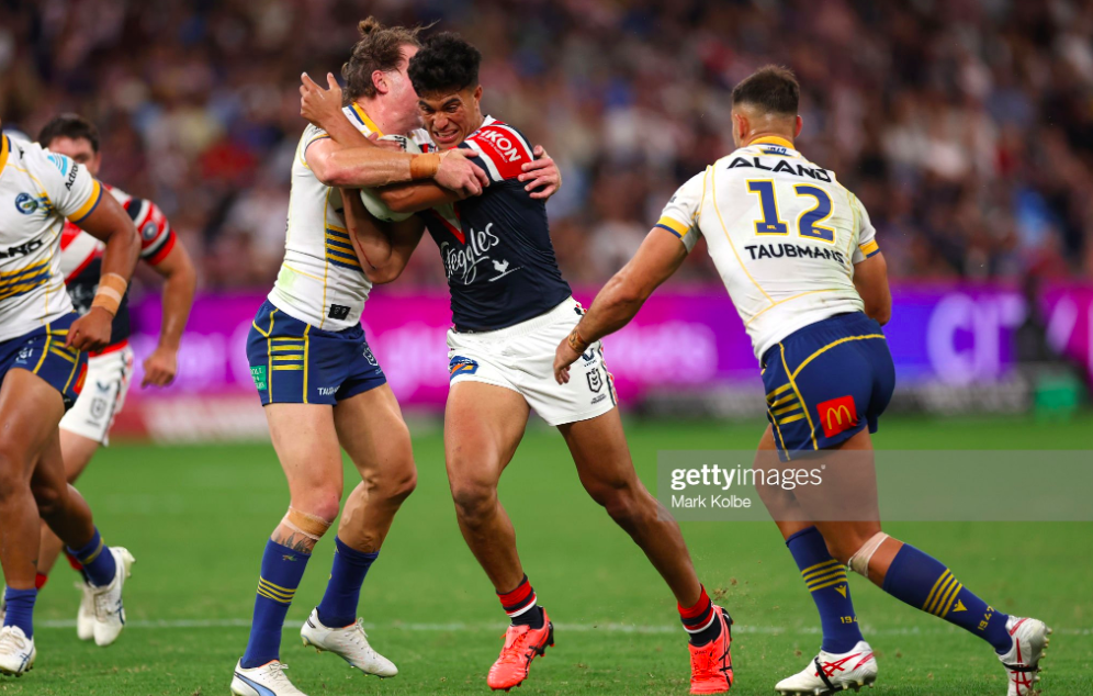 The news of Joseph Suaalii signing with Rugby Australia didn’t dent the Roosters’ spirit when they rocked up to host the Eels at Allianz on Thursday. Nor did losing James Tedesco at the twenty-fourth minute, when Bailey Simonsson came in for the nastiest shot of the year so far. Joey Manu was willing and able, but Suaalii stepped into the fullback role, and will likely remain there with Teddy out for the requisite eleven days, as the Chooks kept the Eels tryless until the second stanza, and weathered a final five minute surge to come away with 28-20.