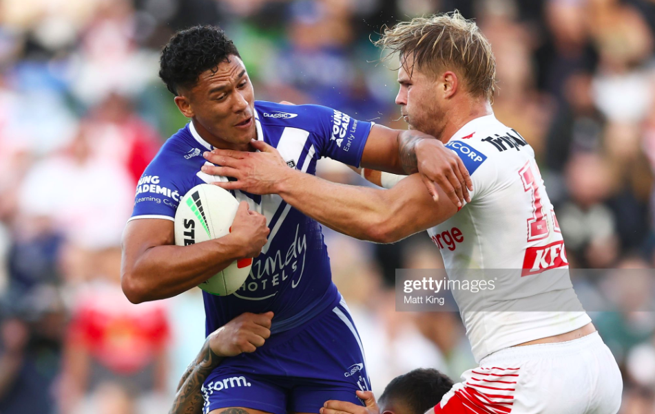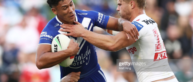 It was the wrong decision, since not only did Kurtis Morrin cough it up on tackle one, but Preston was promptly penalised for holding down, laying a platform for Bird to offload out to Lomax for the Dragons’ best left edge raid since Feagai’s try. They swung it back to the other wing, where Casey made another error, but a critical trysaver, reaching out to intercept a Sloan-Suli ball, and knocking it on in the process. Waddell was back on the park now, but the Bulldogs were again defending their chalk against a renewed period of leadership from Hunt.