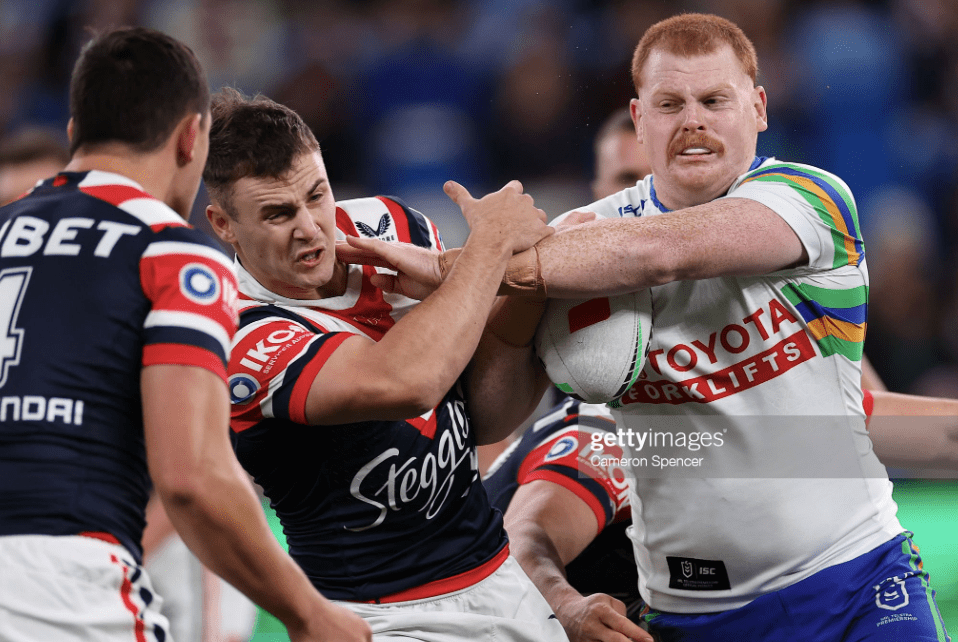 Add a second frustrated grubber from Fogarty that Drew Hutchison took on the ground, and there was a glimmer of hope for the Roosters here, especially once Nathan Brown trotted on to add some fresh energy to the forwards, in place of Radley, who hadn’t made a massive impact so far on his return from suspension. Young got his revenge for the Smith-Crichton combo a moment later with a brutal shot to keep Teddy in the ten beneath yet another Fogarty bomb, and the skipper responded by attempting to make his first break on play four.