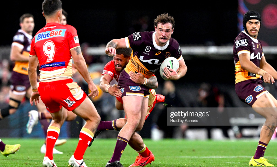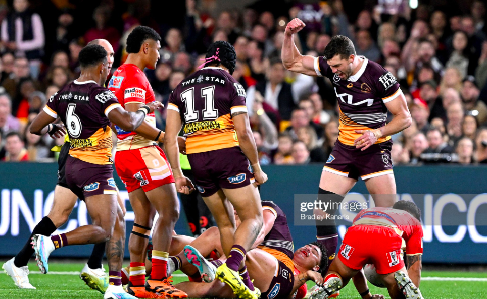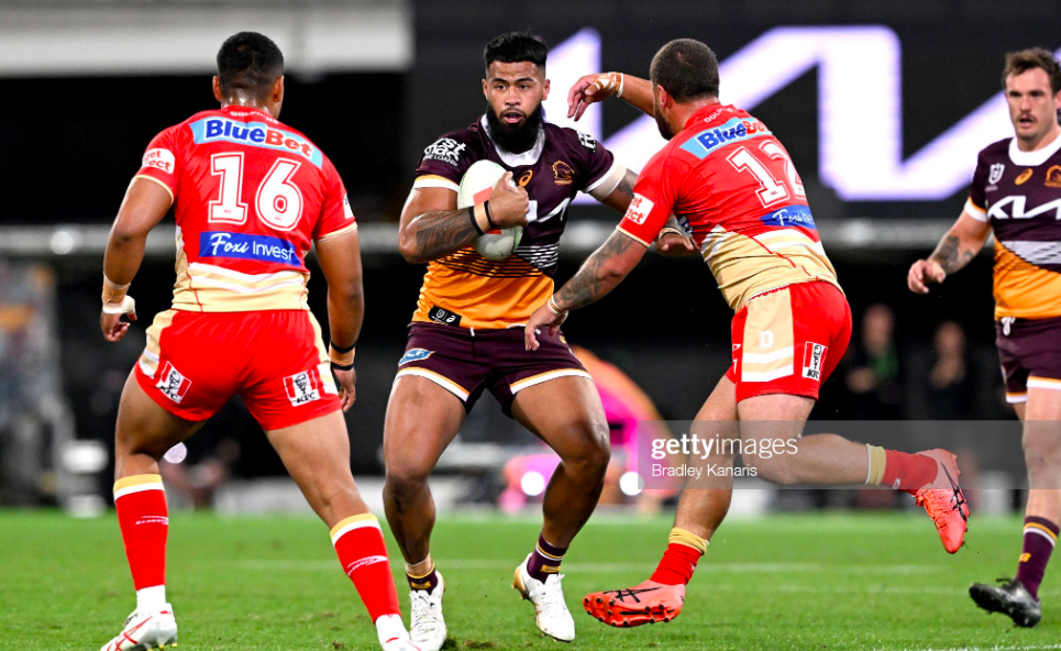Yet this dramatic opening Dolphins sequence only intensified further when the try was called back for a Lemuelu-Reynolds obstruction, an abrupt enough shift in fortune for the Broncos to now absorb the visitors’ consolidation as their own. Tristan Sailor laid the platform with a bomb that trapped Niu in the ten, right in the corner, as Brisbane proceeded to keep the red and white in their own thirty for most of the subsequent set. As a last resort, Te Whare tried to reprise his mad dash down the right side, but only exhausted the last residues of that run.