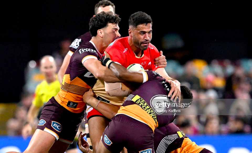 It was clear, then, that the hosts had one of two options – to summon a new cohesion, or else to rely on an individual play so transcendent that it could gather all the energy of this set into itself. Cobbo provided the latter on the last tackle, while also culminating the aborted short side plays of the last few sets, with a display that would be enough to cement him as a Brisbane icon even if he never played another game of football. The first step was receiving the ball on the right edge and getting outside Katoa, as Niu set his sights on containing him.