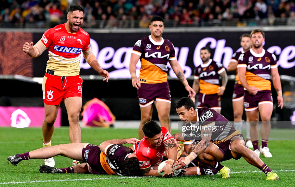 Katoa tried to resume the Dolphins’ flow with a decent enough bomb, but while it took Cobbo off balance, the star backliner still managed to collect it clean as the Hammer piled on top, before providing his men a strong run on play two to get them out of the red. Farnworth couldn’t make much more headway in the face of Kenny Bromwich, so it was Hetherington who ended up shifting the balance for Brisbane – by adamantly insisting that Reynolds send a challenge upstairs to prove that his lost ball had actually been an illegal strip from Aitken.