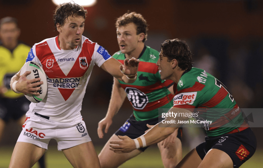 The Dragons were unable to capitalise on home territory, or win their first Charity Shield double since 2011-2012, on Valentine’s Day evening, as a less experienced South Sydney trial side put up a resilient fight to come away with a four-point win. Donning the cardinal and myrtle jersey tonight was Matt Dufty, in his first NRL appearance since departing the Dogs for Super League at the end of 2022, and his gutsiness against his most iconic former club helped spawn Souths’ golden period before and after the break.